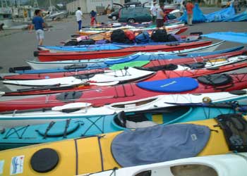 小泊の港にならべられたシーカヤックと、向こうに見えるのはファルトの袋の山。