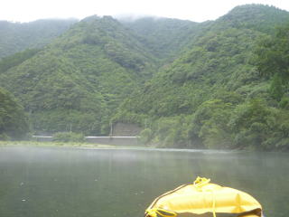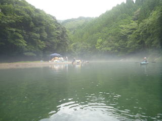 水が冷たくて外が暑いので、川霧がたちます。