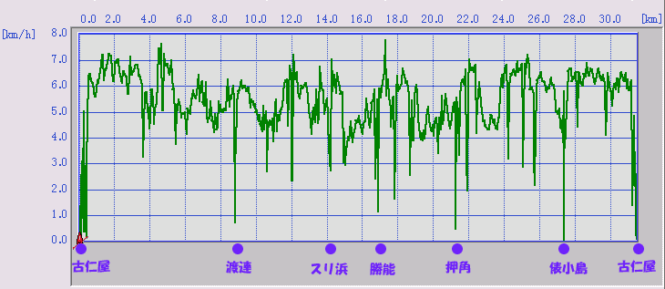 その1 その2 その3 その4 GPSのデータを掲載。 嘉鉄から渡連の海峡渡りは、向こうの漁船の誘導もあって、 けっこう内側を漕いでいます。あんまし流されなかったのですけどね。 ゴールの古仁屋の手前でちょっと曲がっているのは、水中観光船が来たので、進路を避けろと指示があったので。 けっこう迂回してしまっているなあ。 前半部はまったくいいペースなんです。 海峡渡りをしたあたりからペースが落ちていますね。スリ浜から押角あたりがやはり遅い・・ 俵小島過ぎてから、けっこうハイペースになっていることがよくわかります。