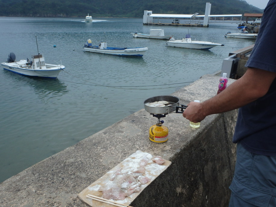 で、2日目に釣った3枚おろした魚を取り出して、これでお昼にすることにする。