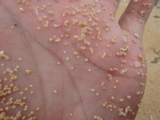 手のひらに砂をつけてみると、そのなかから星の形のが見つかる。