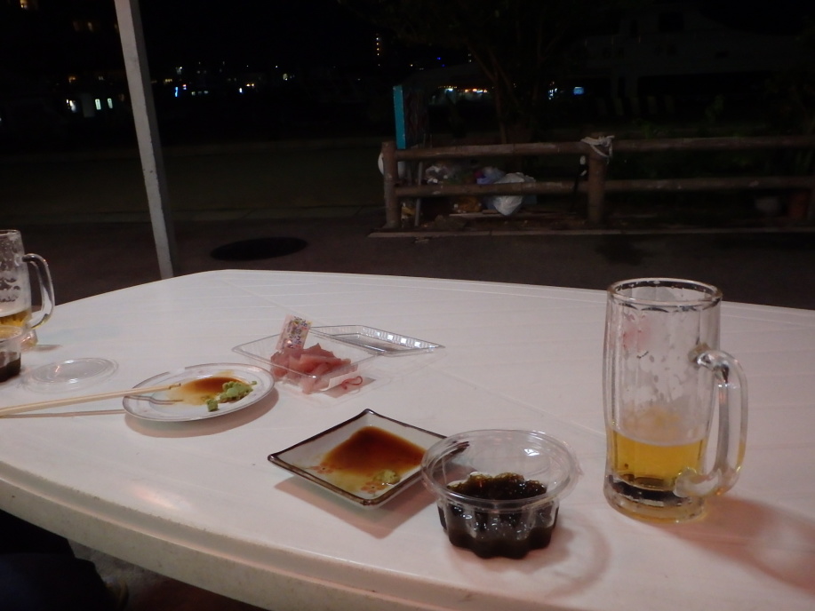 最初に港のそばの直売所の店先で刺身をつまみにビール。