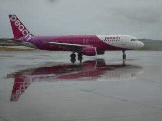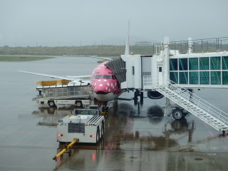 帰りは、ちょうどイベント飛行機にあたり、ピンクのクジラが描いている機体で帰ってきました。