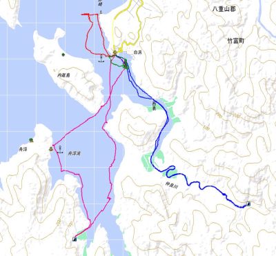 ピンクが三日目。海に落ちる滝を見て、船浮まで行った日(14.1km)