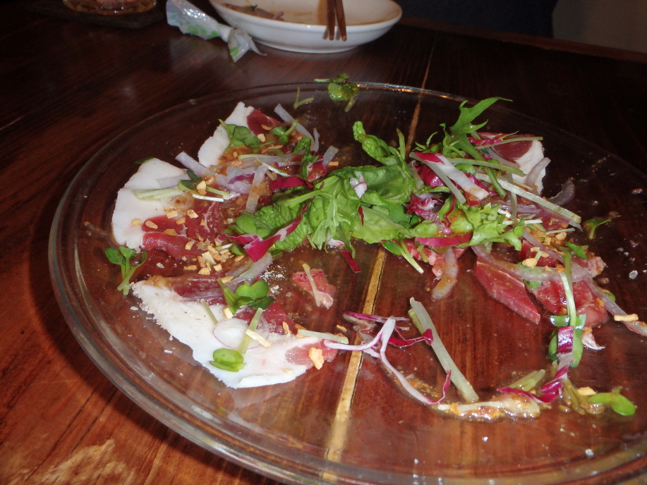 イノシシのカルパッチョ。いや、生のイノシシ肉が食べられるなんて。