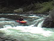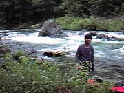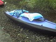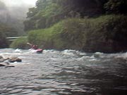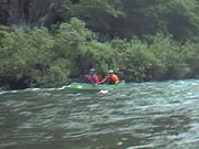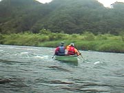水は澄み渡ってて水温も低い。いくつかの瀬を過ぎると吊り橋の場所まで来た。このあたりから中流部。残念ながら日差しはないが緑の中をキラキラ流れて行くといった感じだ。この雰囲気大好き。 女神橋手前の左岸で休憩。犬の散歩をしている人がいる。この犬はどうもパロミータが気に入ったみたいでしきりにじゃれついてきた。 女神橋を過ぎて大きく右にカーブしたあとで左カーブ。6月にキャンプした河原だ。あのときの焚き火も良かったなぁと思い出しながら更に下る。 右岸に砂利工場の音がする。適当なウェーブがあるところで休憩。ぽからさんがパイドラを借りてサーフィンに挑戦するがキャンペットとは勝手が違い過ぎて難儀していた。
