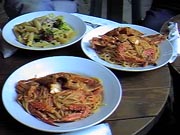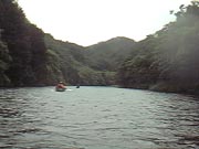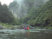 上陸予定地点は昨晩下見した道の駅付近。運動公園が併設してあり橋があるのでわかるはずだ。先行したAPPONさんが橋手前左岸に上陸した。でもどうも雰囲気が違う。川地図も5万図もないので正確な位置はわからないが橋が違うのでAPPONさんに声をかける。「ここじゃないよ〜。もうちょっと先みたい〜。」 1km位下で上陸。岸から上がった場所が駐車場になっているベストポジション。後でわかったが道の駅の隣にある畜産市場だった。 8km程を2時間くらいで遊びながら下った。ショートツーリングだが小本川のおもしろいところを下ったことになる。夕方まであれば海まで行けるねぇなんて話しながら撤収にとりかかる。 私は手早く着替えをすませた後、パロミータの解体はぽからさんに任せて回送に出かける。道の駅で電話を借りてタクシーで戻る予定だったが売店の人にバス停を聞くとすぐ近くだという。行ってみるとあと10分で10:20の岩泉行きがやってくる。ラッキー。バスを待っている間、道の駅で買ったソフトクリームを一人で食べた。ちなみにこの便を逃すと次は12:02だった。 バスは岩泉駅まで行くが、途中、龍泉洞に立ち寄る。完全に寄り道になるが仕方ないねえ、このあたりの観光の目玉だし。でもその寄り道のおかげで龍泉洞温泉ホテル前で「日帰り入浴出来ます」の看板発見。 岩泉営業所でバスを降りて出発地点のデリカの位置まで10分ほど歩く。車をとめた場所の近くにホルスタインがいて草をはんでいたのにはビックリした。 ファルトは3艇とも解体して荷室に納めると屋根にはパイドラだけとなった。 APPONさんは夕方に花巻空港から北海道に渡る。IPPONさんは夕方までに仙台のホテルにチェックインの予定。まだお昼前だしまずは温泉に行きましょう。 月曜日お昼の温泉ホテルはがらがらだった。価値ある\500を払いのんびり湯に浸かる。風呂上がりのIPPONさんはYシャツに革靴スタイルだった。 ホテルの女将にお奨めの昼食場所と名物「水饅頭」を売ってる店を教えてもらい龍泉洞前のレストランへ行く。行ってみると立派なイタリアンレストランだった。パスタ料理に舌づつみを打ち、再び幸せな気分。よく考えると北上川リバーツーリングのはずなのに焼き肉、ウニご飯と続いて食べ歩き旅行のような気もする。いや、北上も58km漕いでるし、小本川もいちばん美味しいところを下ってる。川も食事も最高の岩手2川ツーリングだった。