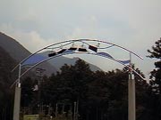 見ると休憩所の入り口の上にこの辺の名物の筏くだりのレリーフがかかっていた。