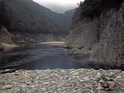 その下の瀬を越えると大きな瀞。ここまでジェット船が上がってきて、方向転回するのだという。既に夕方になっているので、渓谷は静か、静か。