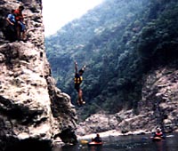漕ぎだしてすぐのところに瀬がある。先ほど水量不足でひやひやした瀬だ。これを下ると、さっきの筏の下船場があった。ここでは、下まで流れ得来た筏舟をクレーンで道のあるところまでひっぱりあげている。なかなか下から見上げると豪快な荷物である。