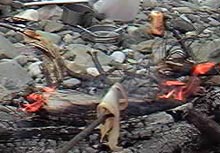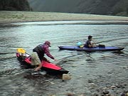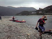 ちょうどそのとき横にぷうさんがいた。やけに岸にちかいところにいる。ちょっとあぶないんじゃないかなと思っている間、ざっと波が引くとぷうさんのカヌーは岩場の上に乗っかっていた。カヌーも水がなければどーしようもない。数回の波を岩の上で耐えていたようにも見えたが、けっきょくぷうさんは沈。荷物のバドワイザーが流れてくる。