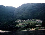 のんびりした流れ、ちょくちょく団体でやってくるジェット船。やがて正面に段々畑の集落が見えてくる。地図で見ると「上地」とある。今回のツーリングで段々畑を見るのははじめて。それほどこのへんは切り立った山の中なのだ。