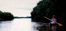 直線コースが終わると流れはぐっと細くなり、蛇行をくりかえす。釧路湿原のなかに入ったのだ。両岸の風景はうっそうとした林のなか。川のアウト側には木が張り出してきていて、ぼけっと本流に乗っているとひっかけそうである。と、いっても源流部よりよっぽど広いし、木も少なく、流れもゆるい。ゆったり風景を見ながらくだってこれる。