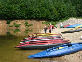 浜に広がるカヌースクール用のハイビックスのカヤック。