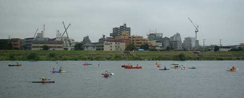 いつも通勤列車から見下ろしている、多摩川・登戸狛江の川面に、たくさんのカヌーが浮かんでいる様は