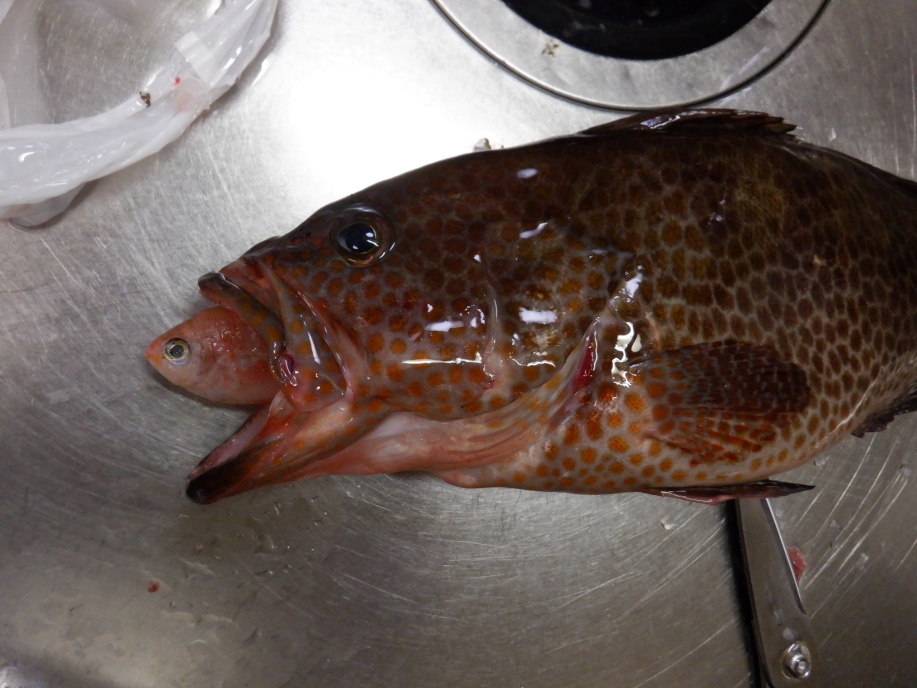 さばいていたら、オオモンハタの口から丸呑みしたサカナが出てきた。