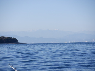 向こうに見える、頂に白いものがついている山脈はどこだろう。