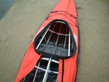 カナールでは、木製カヌーのときから、船体の後尾に「くさび形」のパーツをはめ込んでテンションをかける方式をとっています。このパーツが、艇が新品の時にはかなり堅くなります。新規購入時には組みっぱなしで1,2週間ほど放置しておくといいようです。これがひと冬越すとまたはまらなくなったりするのですが。